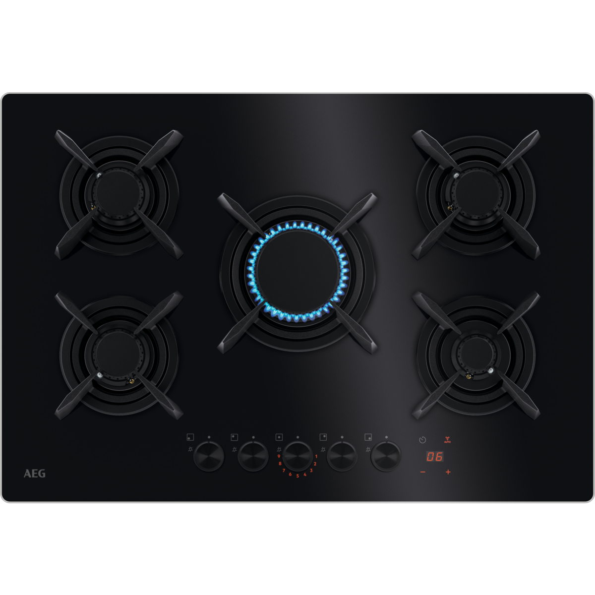 75 cm - FlameLight - Nuovo Vertical Flame - comandi LED - Step power - 5 bruciatori gas di cui 1 Ultra Rapido 3,8kw - Accensione integrata nella manopola - Buzzer: funzione segnale acustico - Indicatore di calore residuo - Sicurezza gas - Griglie singole in ghisa - Connessione piano-cappa H2H - comandi frontali - Estetica in vetro nero - Corone bruciatori Matt black trattamento EasyClean, lavabili in lavastoviglie e con manopole finitura nero