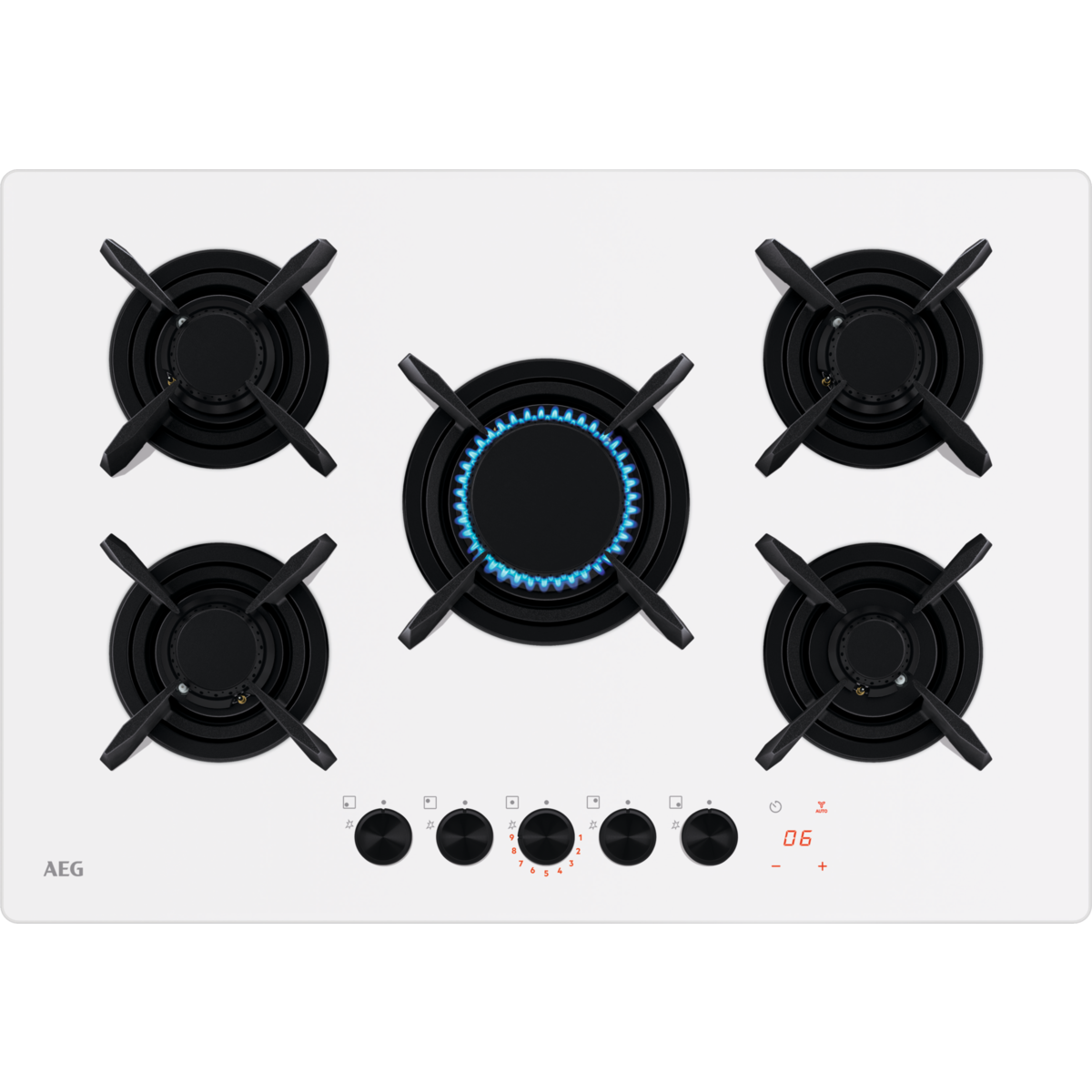 75 cm - FlameLight - Nuovo Vertical Flame - comandi LED - Step power - 5 bruciatori gas di cui 1 Ultra Rapido 3,8kw - Accensione integrata nella manopola - Buzzer: funzione segnale acustico - Indicatore di calore residuo - Sicurezza gas - Griglie singole in ghisa - Connessione piano-cappa H2H - comandi frontali - Estetica in vetro bianco - Corone bruciatori Matt black trattamento EasyClean, lavabili in lavastoviglie e con manopole finitura nero
