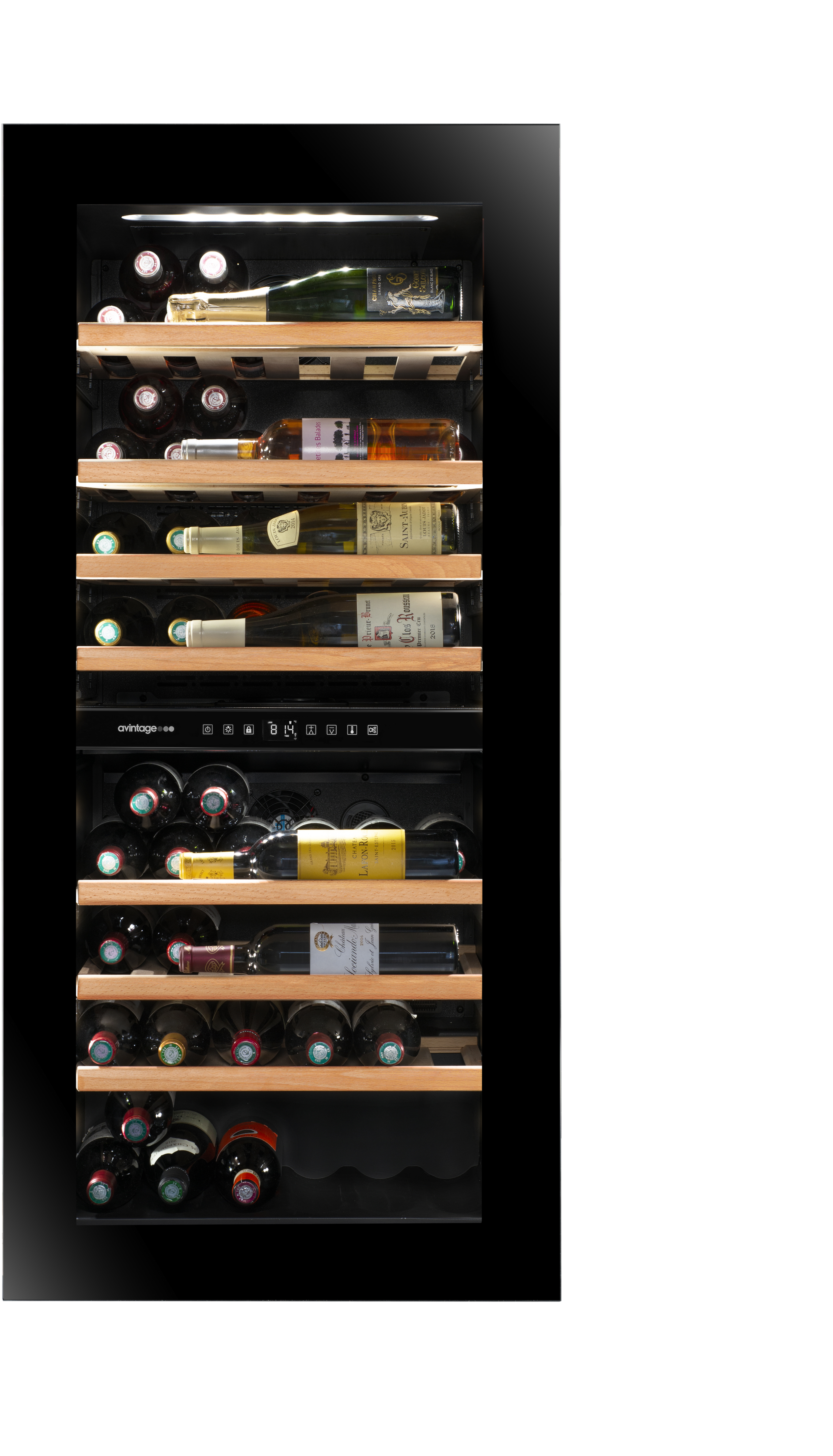 64 bottiglie, APERTURA PUSHPULL, REVERSIBILE, CONNESSIONE WIFI, GESTIBILE CON VINOTAG, colonna ad incasso per nicchia sottopiano, abbinabile con mobile da 72 cm, 2 zone mono-T (5-12C & 12-20C) , regolazione elettronica e display bianco, porta nera in vetro nero a 3 strati anti-UV e basso emissivo, ripiani in legno scorrevoli su 7 guide, 2 piedini regolabili (2 cm), luce LED laterale interna con 3colori disponibili (Ambra/Bianco/Bianco freddo ) con dimmerabile.