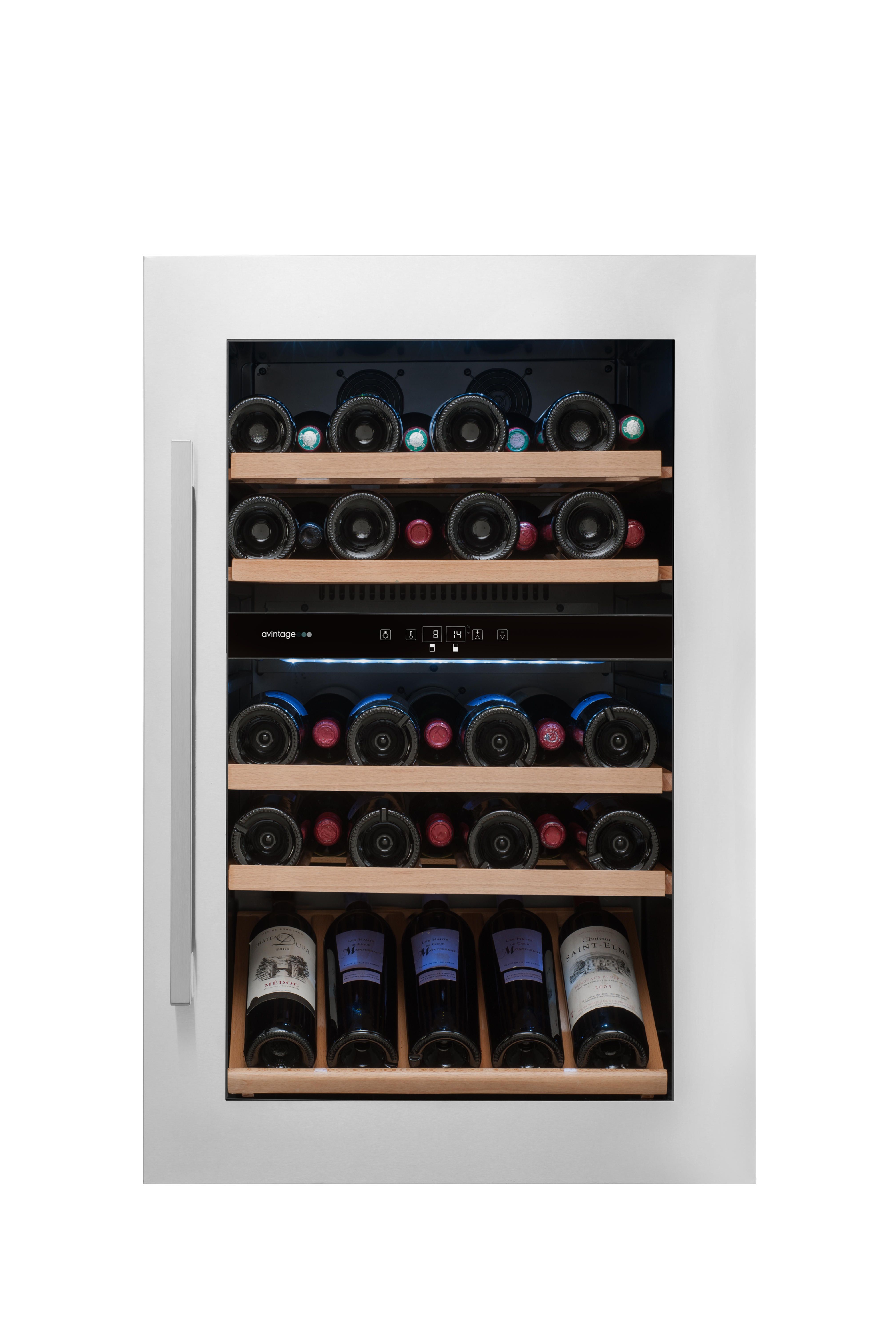 52 bottiglie, colonna ad incasso, 2 zone mono-T (5-18/5-18C), regolazione elettronica e display bianco, porta in vetro anti-UV reversibile a 3 strati con telaio in acciaio inox, 4 ripiani scorrevoli in legno e 1 ripiano espositivo fisso in legno, 2 piedini regolabili (1 cm), luce interna a LED