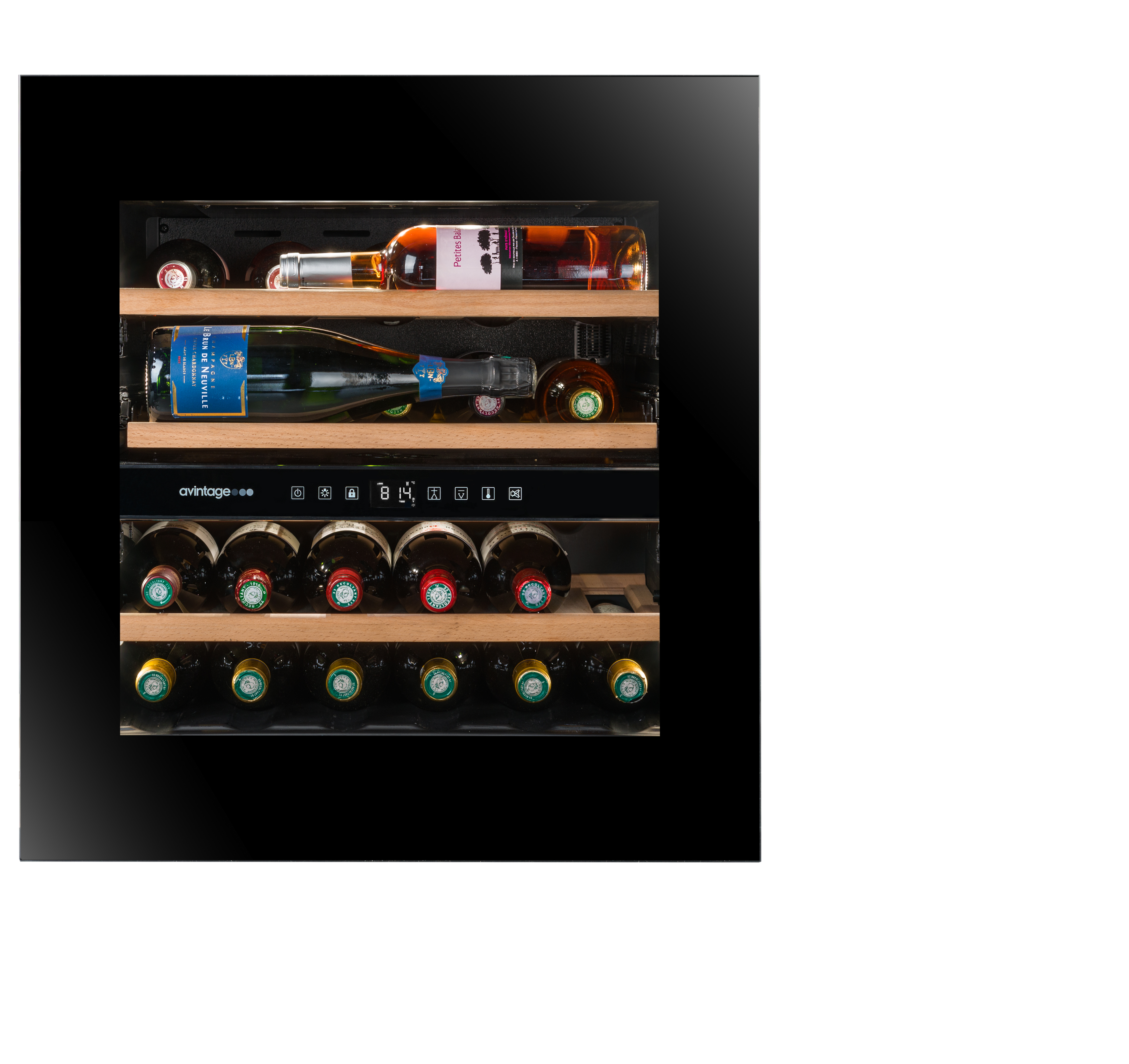 24 bottiglie, APERTURA PUSHPULL, REVERSIBILE, CONNESSIONE WIFI, GESTIBILE CON VINOTAG, colonnina ad incasso, 2 zone mono-T (5-12C & 12-20C), regolazione elettronica e display bianco, protezione anti-umidit a 3 strati Anta nera in vetro UV e basso emissivo, 3 ripiani scorrevoli su binari in legno, 2 piedini regolabili (2 cm), luce LED laterale interna con 3 colori disponibili (ambra/bianco/bianco freddo) con dimmerabile.