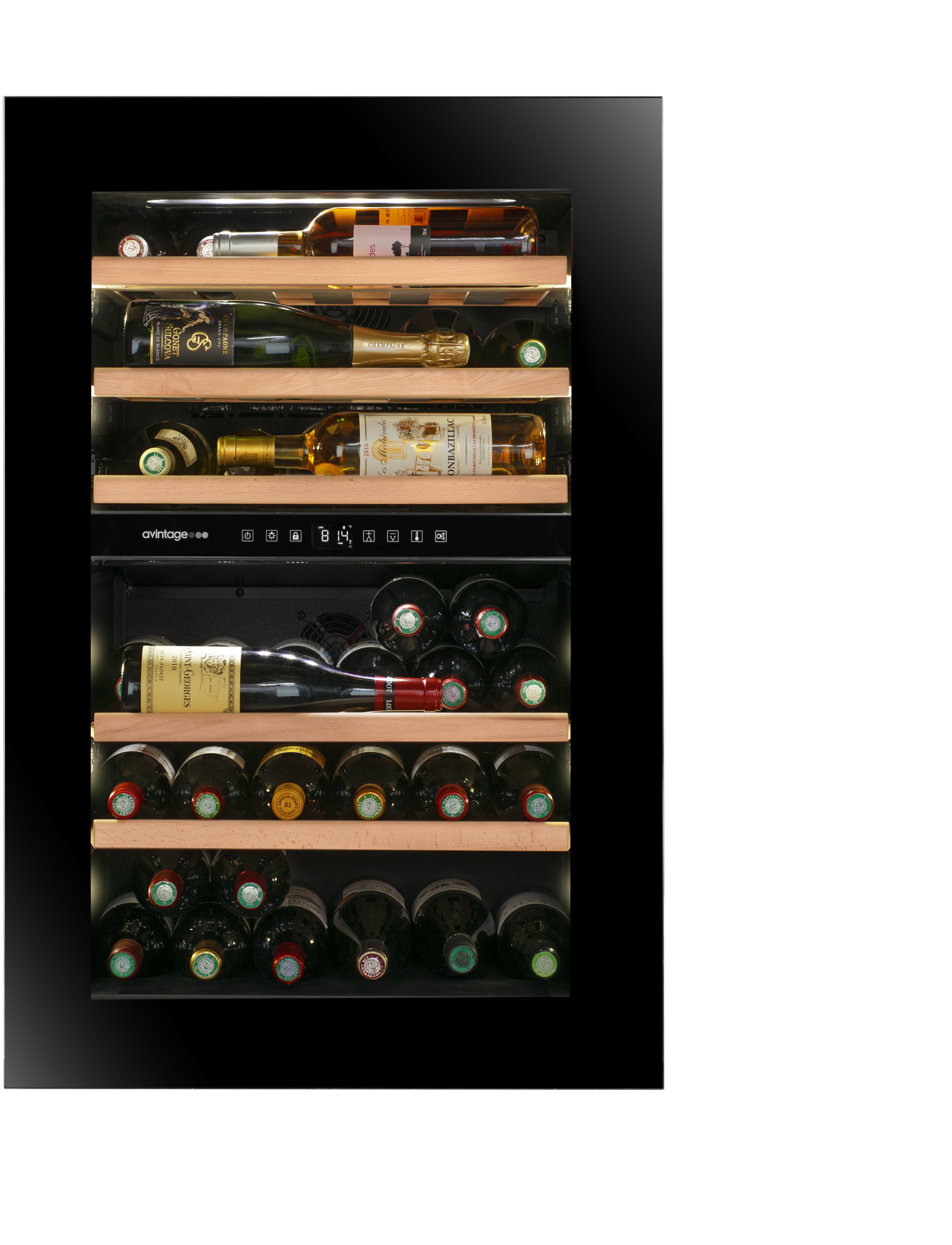 29 bottiglie, APERTURA PUSHPULL, REVERSIBILE, CONNESSIONE WIFI, GESTIBILE CON VINOTAG, colonna ad incasso per nicchia sottopiano, abbinabile a mobile da 72 cm, 2 zone mono-T (5-12C & 12-20C) , regolazione elettronica e display bianco, porta nera in vetro nero a 3 strati anti-UV e basso emissivo, ripiani in legno scorrevoli su 4 guide, 2 piedini regolabili (2 cm), luce LED laterale interna con 3 colori disponibili (Ambra/Bianco/Bianco freddo ) con dimmerabile.