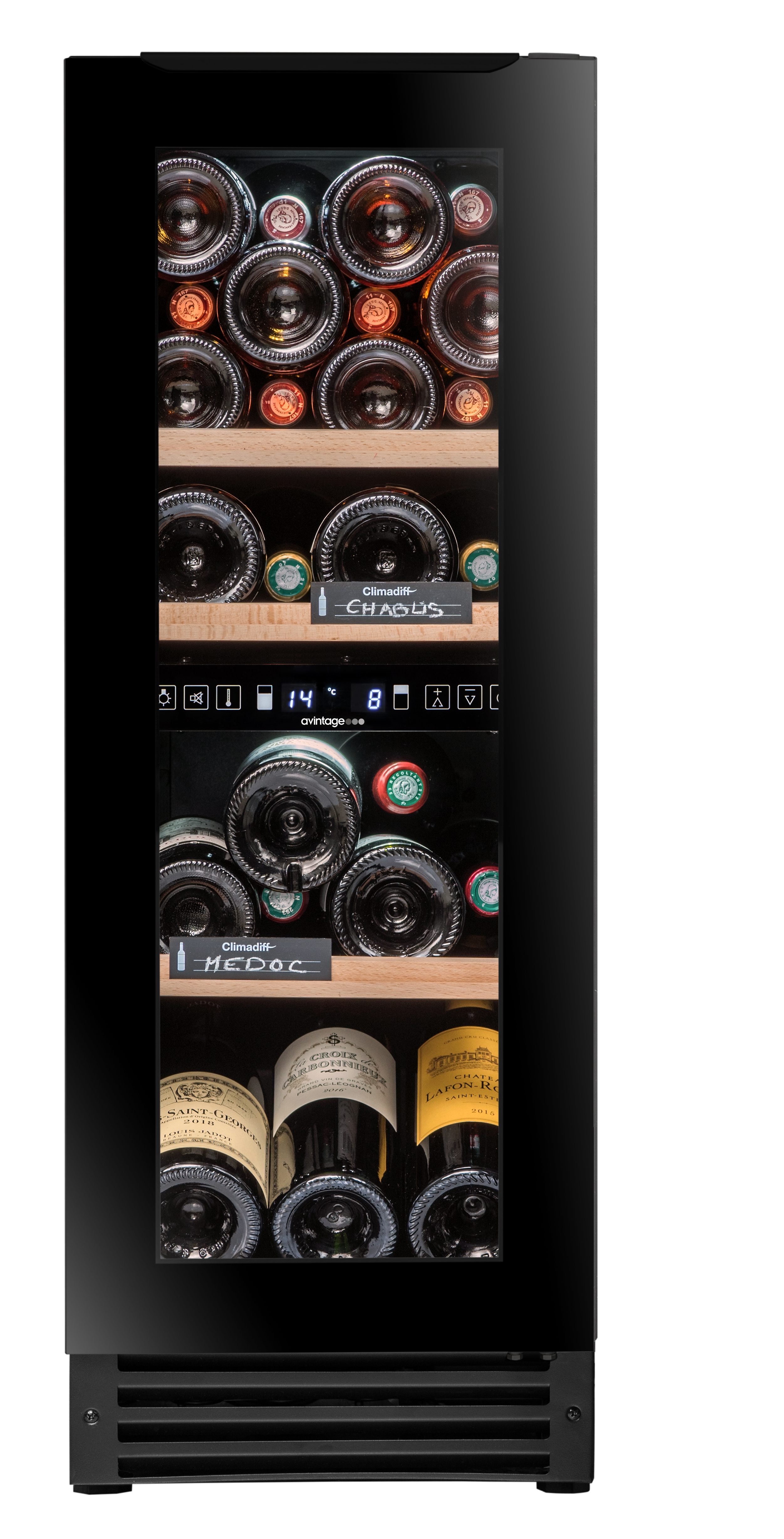 25 bottiglie, installazione sottopiano, 2 zone mono-T (alto: 5-12 / basso: 12-20C ), regolazione elettronica e display bianco, porta nera in vetro anti-UV reversibile a 3 strati con top a scomparsa maniglia, 3 ripiani scorrevoli in legno, 2 piedini regolabili (7 cm), luce interna a LED