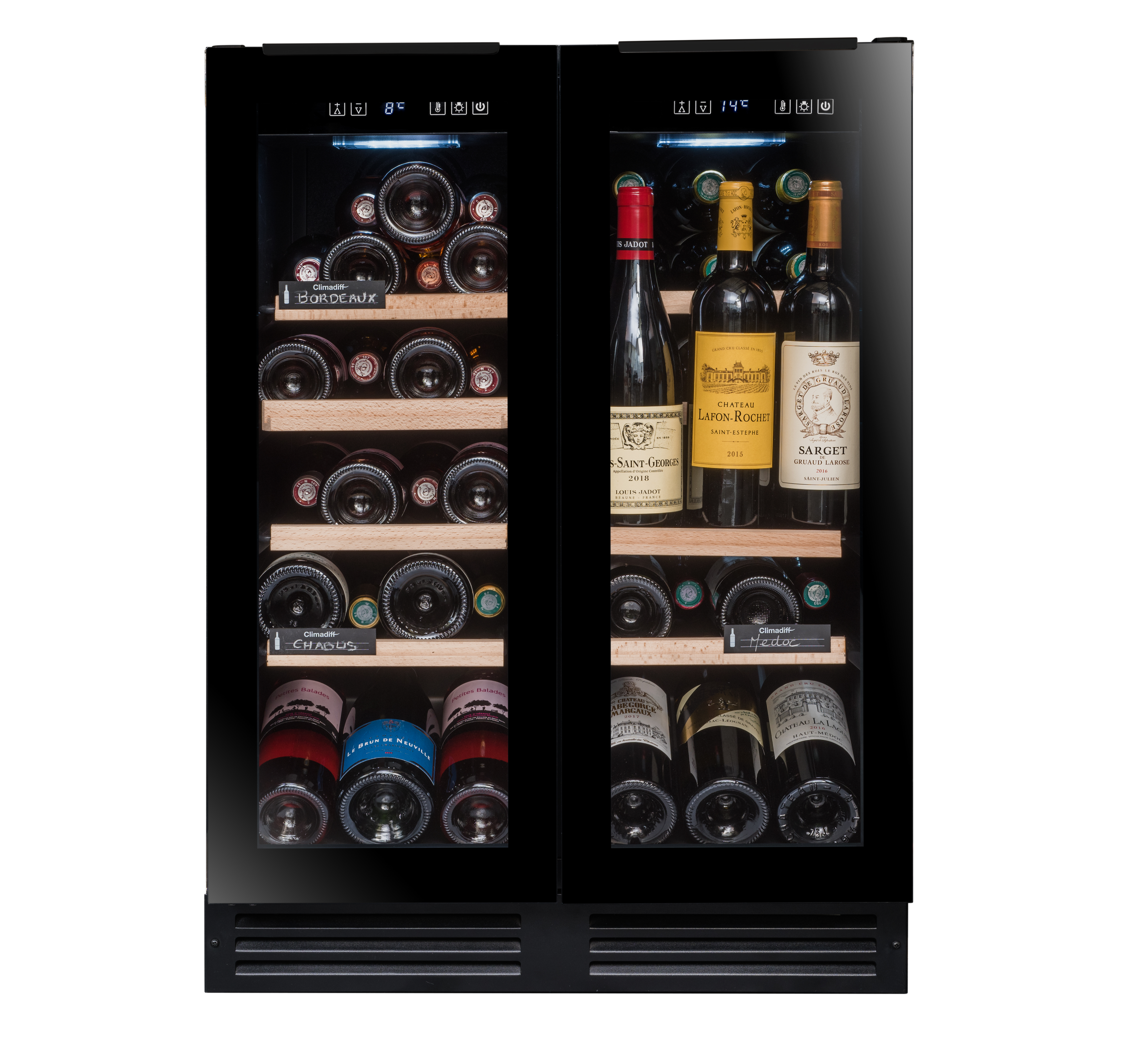 47 bottiglie, installazione sottopiano, 2 zone mono-T (5-20C), regolazione elettronica e display bianco, ante in vetro nero a 2 strati anti UV con maniglie superiori a scomparsa, 5 ripiani metallici semiscorrevoli con frontale e 3 semiripiani metallici semiscorrevoli con frontale in legno, vano frontale portabottiglie montante destro, 4 piedini regolabili (7 cm), luce interna a led
