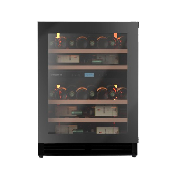 48 bottiglie, CONNESSIONE WIFI, GESTIBILE CON VINOTAG, APERTURA PUSHPULL con CERNIERE A PANTOGRAFO e porta reversibile. installazione sottopiano, 2 zone mono-T (5-12C/ 12-20C), regolazione elettronica e display bianco, porta nera in vetro nero reversibile a 3 strati anti-UV, 4 ripiani scorrevoli su guide in legno e 1 piano in legno scaffale da presentazione MULTIPOSIZIONE, 4 piedini regolabili (7cm), luce interna a LED.