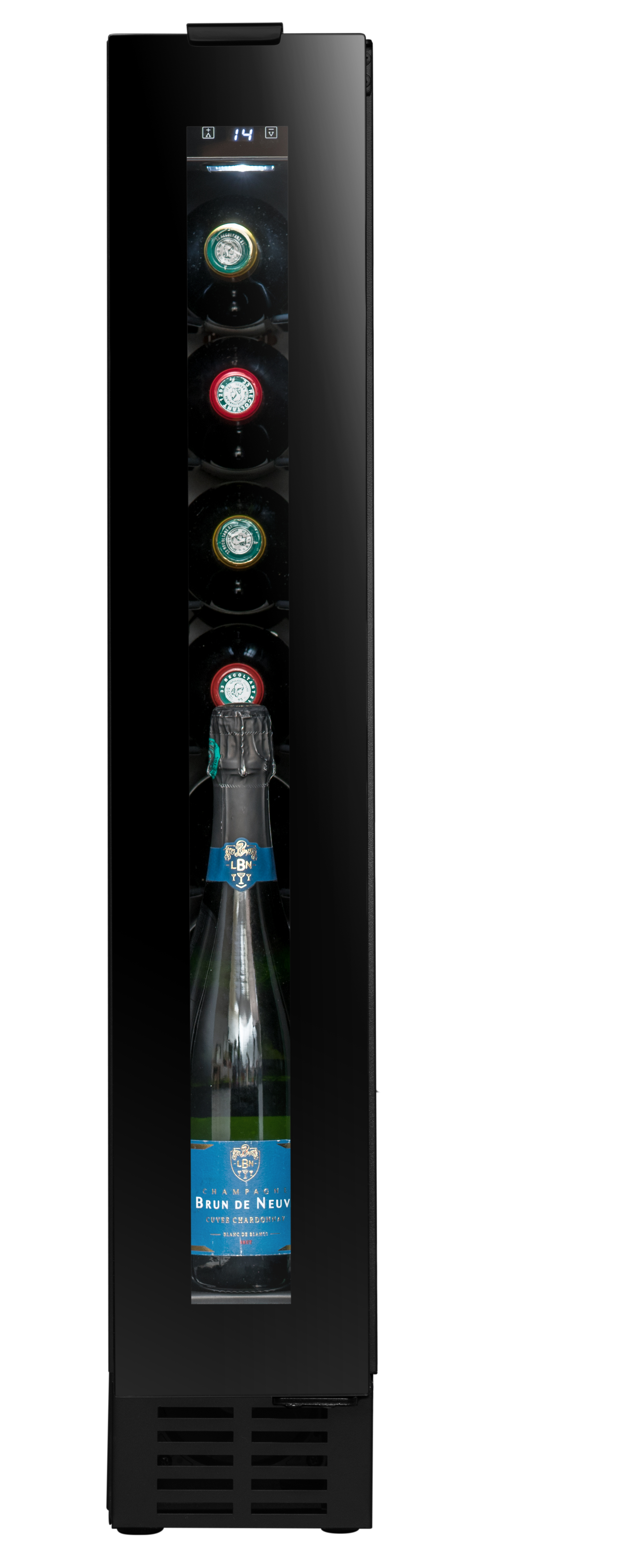 8 bottiglie, installazione sottopiano, 1 zona mono-T (5-20C), regolazione elettronica e display bianco, porta nera in vetro nero reversibile a 3 strati anti-UV con maniglia superiore a scomparsa, 6 ripiani fissi in metallo, 2 regolabili piedi (7 cm), puoi mettere unottava bottiglia di spumante in posizione verticale, luce interna a LED
