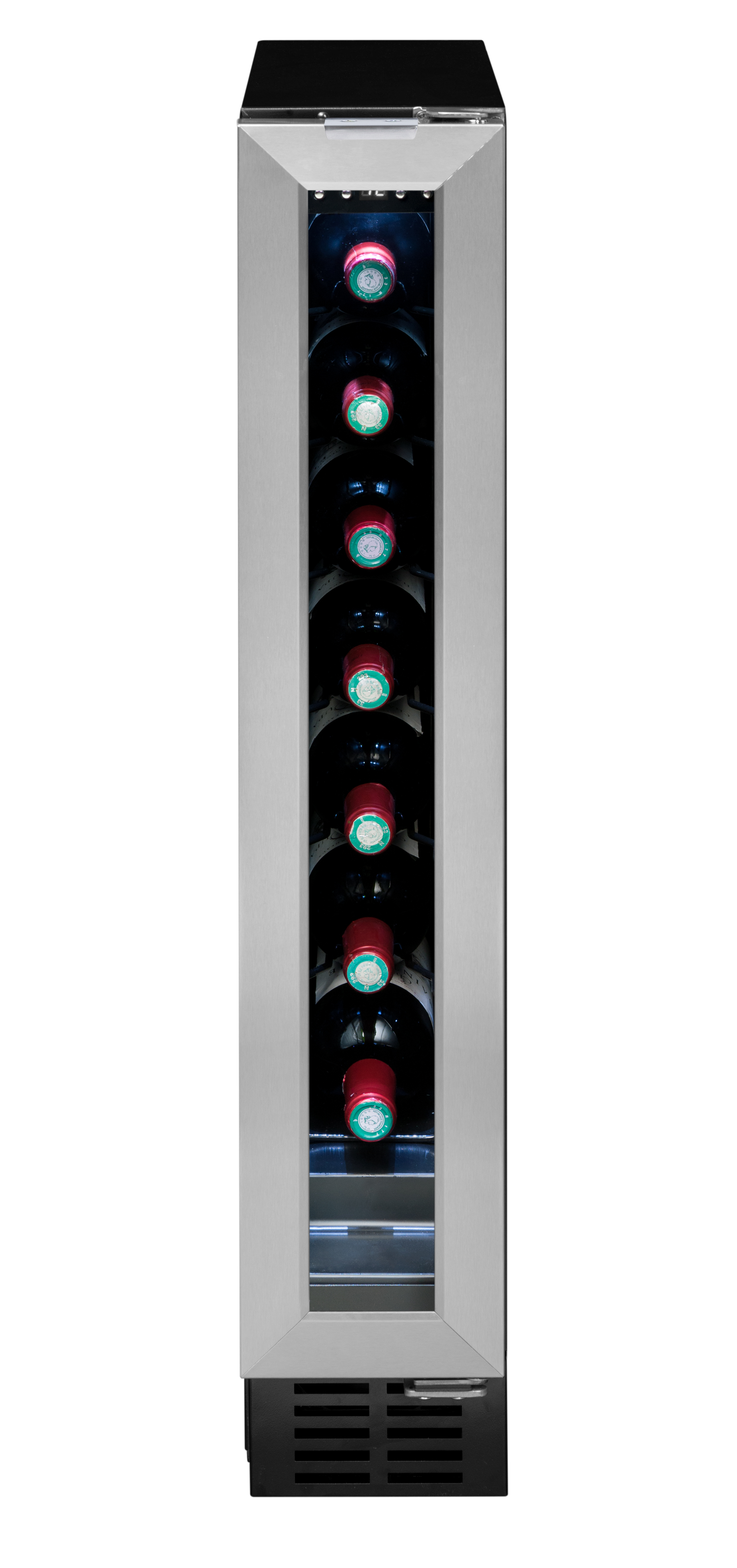 8 bottiglie, installazione sottopiano, 1 zona mono-T (5-20C), regolazione elettronica e display bianco, porta in vetro reversibile a 3 strati anti-UV con telaio in acciaio inox e maniglia superiore ascomparsa, 6 ripiani fissi in metallo , 2 piedini regolabili (7 cm), spazio frontale per unottava bottiglia di spumante in posizione verticale, luce interna a LED