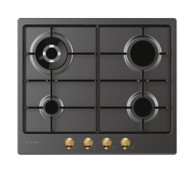 Piano Gas da 60cm ghisa; Griglie in piattina; 4 fuochi DC 4Kw; manopola oro