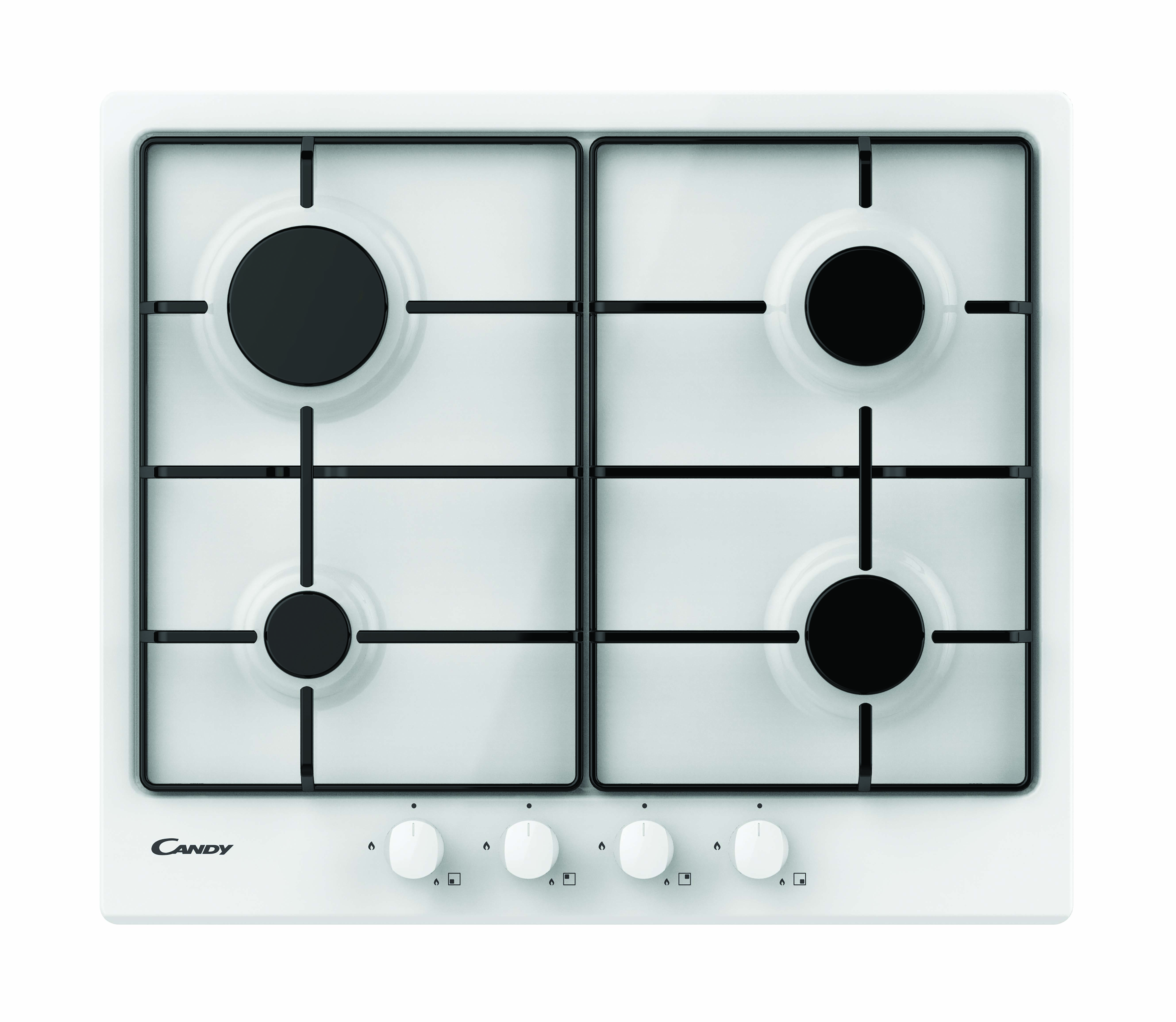Piano Gas da 60 cm bianco; Griglie in piattina; 4 fuochi con Bruciatore Rapido; manopola bianca