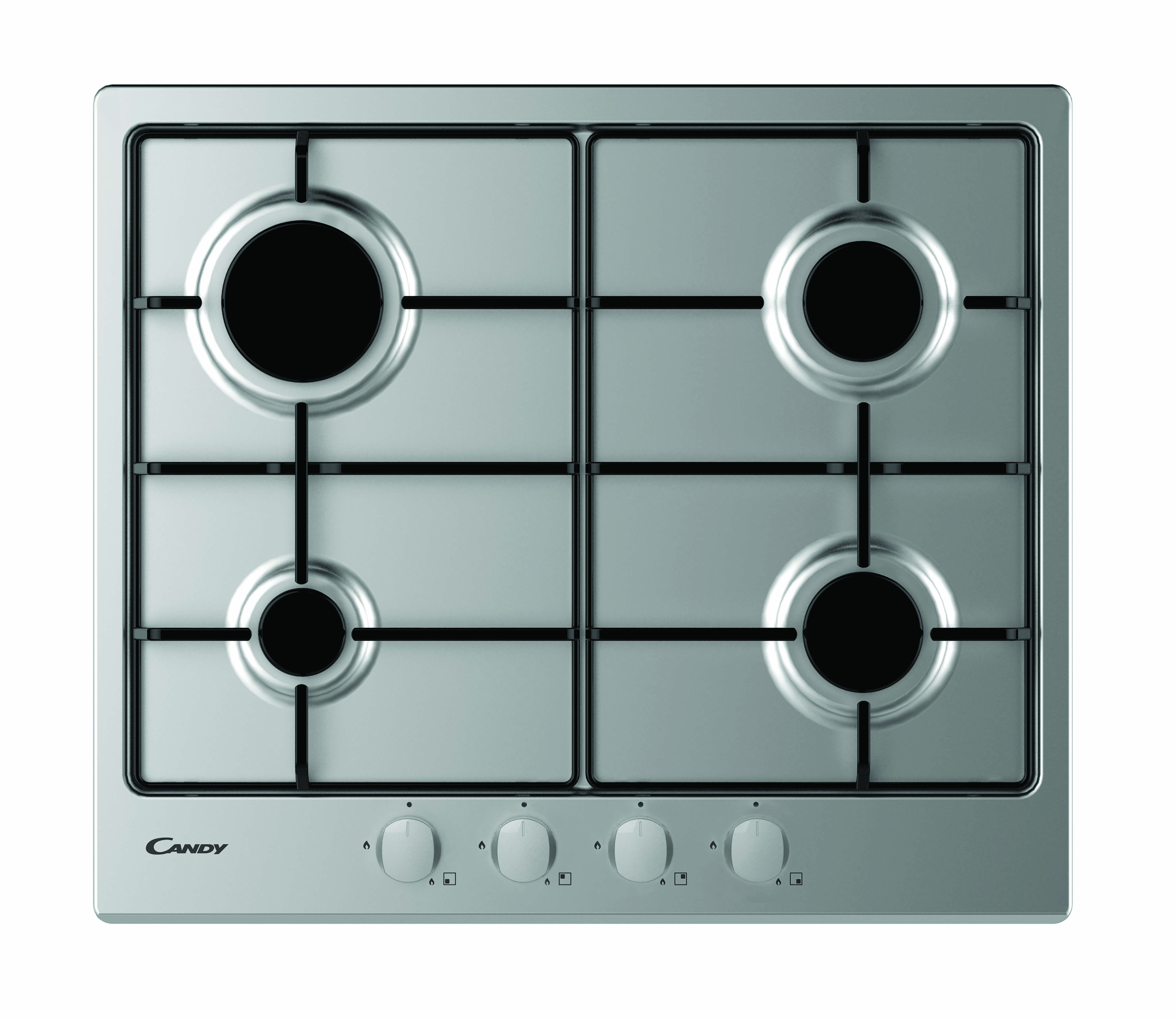 Piano Gas da 60 cm inox; Griglie in piattina; 4 fuochi con Bruciatore Rapido; manopola inox
