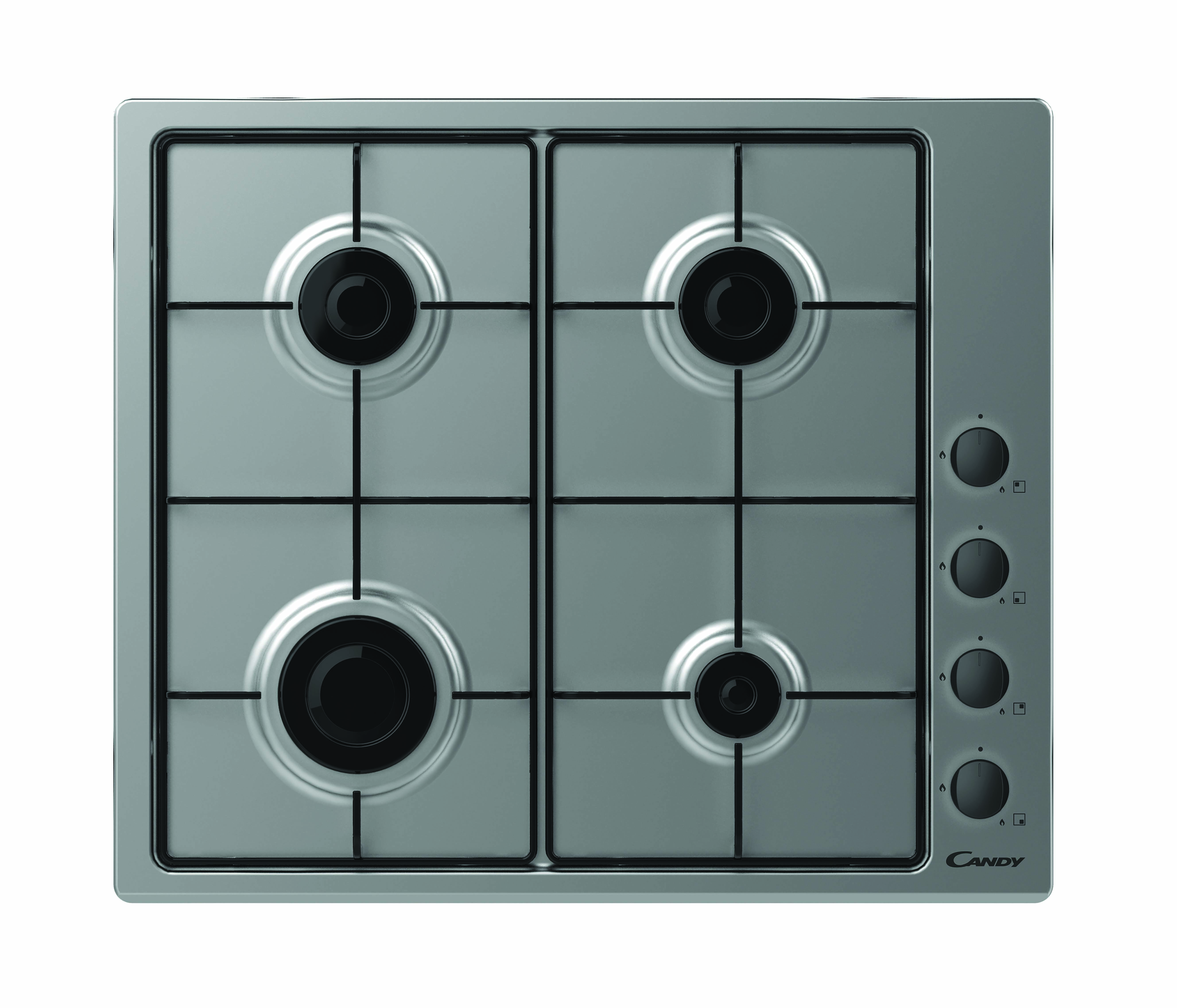 Piano Gas da 60cm lateral inox; Griglie in piattina; 4 fuochi Manopola nera;