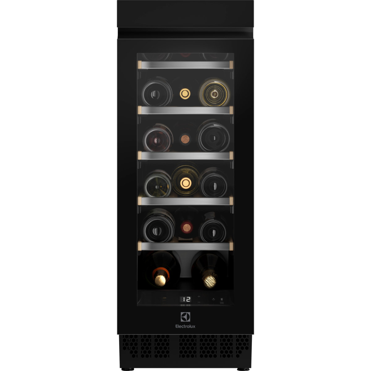 Cantina vino SingleZone - H818, W295 ; Capacit totale 18 bottiglie Bordeaux da 0,75 l; Ventilazione dinamica con umidit tra 50-80%; Indicazione digitale della temperatura regolabile da 5 a 20C; Illuminazione a LED laterale; 6 ripiani di cui 4 in legno estraibili su guide telescopiche; Flessibilit di stivare grandi bottiglie; Porta con triplo vetro contro i raggi UV; Maniglia a scomparsa; Porta reversibile con apertura a destra; Classe energetica G; Silenziosit 38 dB(A); SN-ST; Estetica Intuit Nero opaco