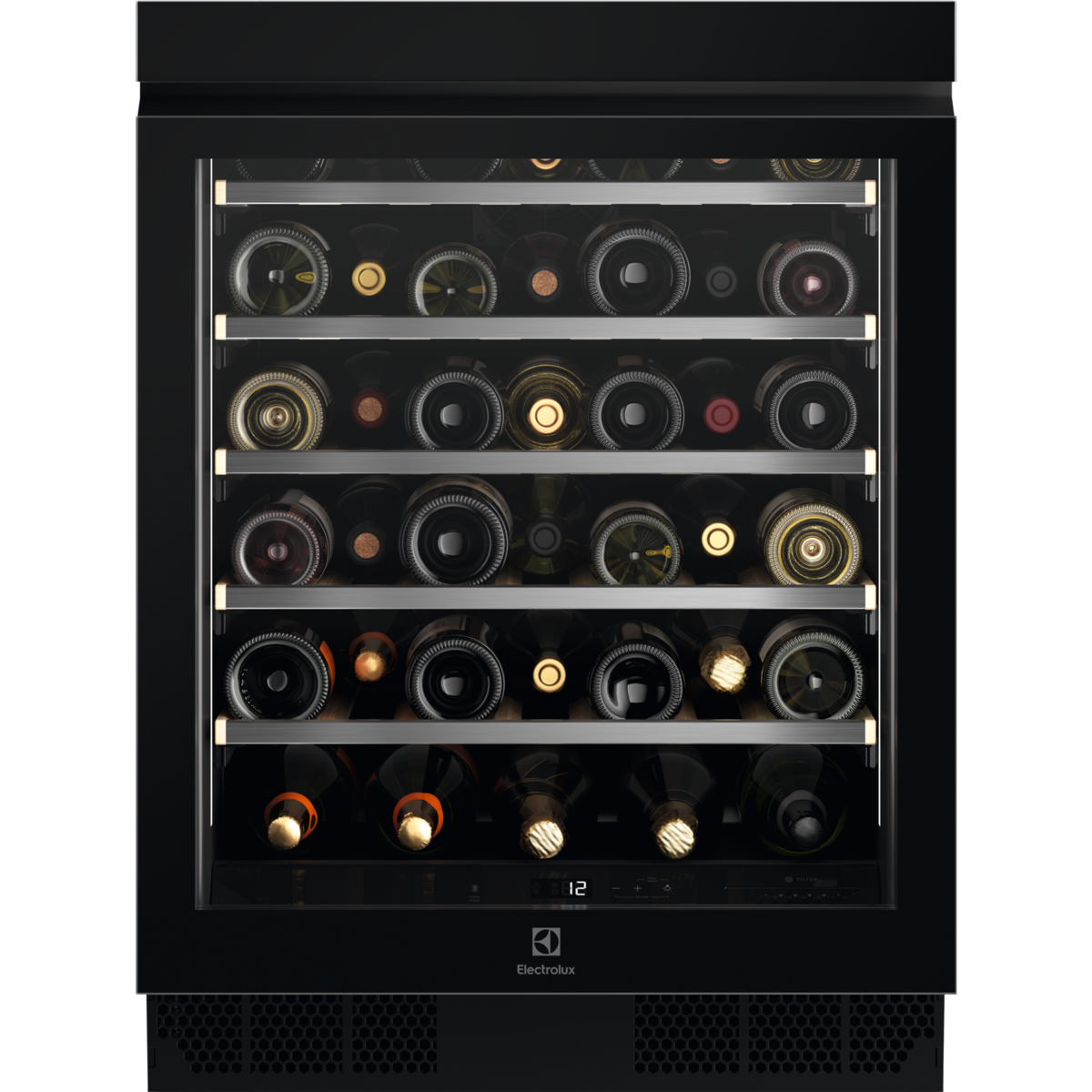 Cantina vino SingleZone - H818, W 595; Capacit totale 40 bottiglie Bordeaux da 0,75 l; Compressore inverter; Ventilazione dinamica con umidit tra 50-80%; Indicazione digitale della temperatura regolabile da 5 a 20C; Illuminazione a LED laterali su entrambi i lati; 6 ripiani di cui 5 in legno estraibili su guide telescopiche; Flessibilit di stivare grandi bottiglie; Porta con triplo vetro contro iraggi UV; Maniglia a scomparsa; Porta reversibile con apertura a destra; Filtro a carbonio attivo; Classe energetica F; Silenziosit 38 dB(A); SN-ST; Estetica Intuit Nero opaco