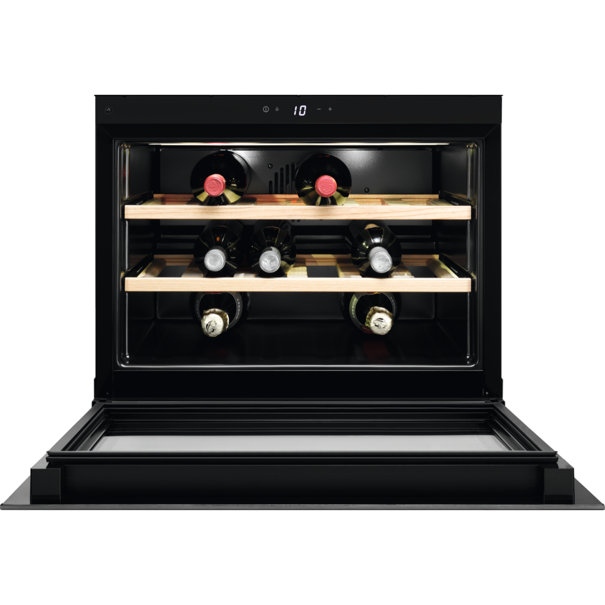 Cantina vino - 45 cm; Volume 49 litri; Capacit totale 18 bottiglie; Ventilazione interna; Indicazione digitale della temperatura,; regolabile da 5 a 20C; Controllo elettronico della temperatura; su display LCD Touch Control; Illuminazione a LED; Indicatore porta aperta; 2 ripiani removibili in legno su guide telescopiche -; 1 ripiano in plastica; Flessibilit di stivare grandi bottiglie; Porta condoppio vetro contro i raggi UV; Apertura porta push pull a ribalta; Classe energetica F; Silenziosit 39 dB(A); Estetica Matte Range