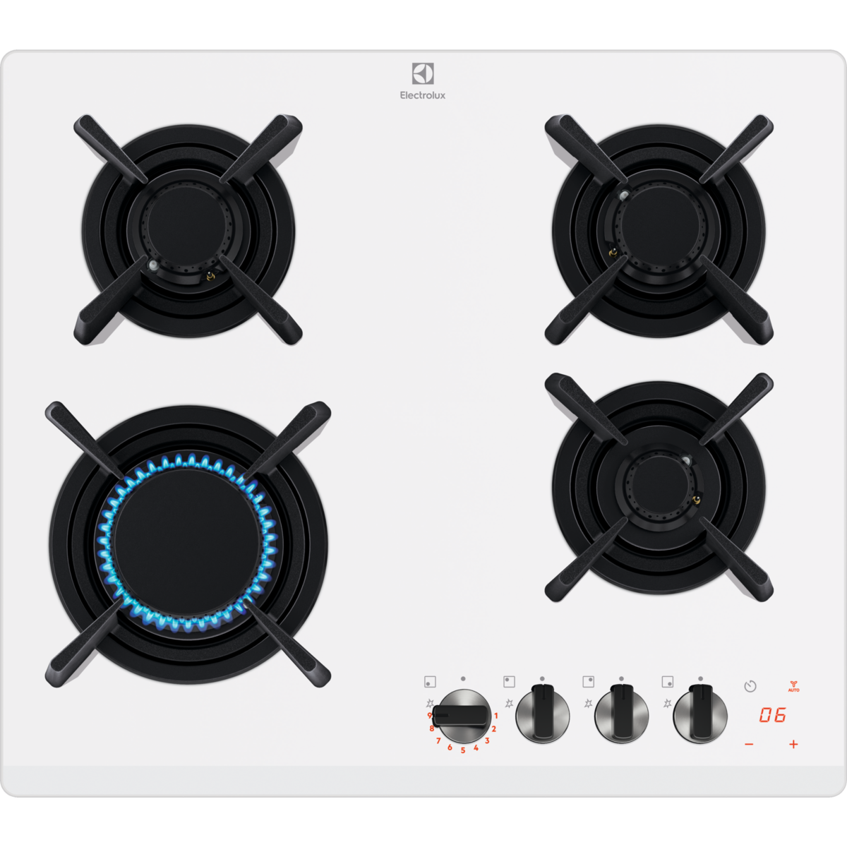 60 cm Gas on Glass - FlameLight - Indicatori LED - Step Power - 4 fuochi di cui uno Hi-Power 3,8kw - Nuovi Bruciatori VerticalFlame - Griglie singole in ghisa - H2H - Accensione integrata nella manopola - Sicurezza Sicurgas - Buzzer: funzione segnale acustico - Indicatore di calore residuo - Estetica cristallo temperato bianco e manopole finitura nero/inox con bruciatori Matt nero opaco con speciale trattamento EasyClean lavabili in lavastoviglie