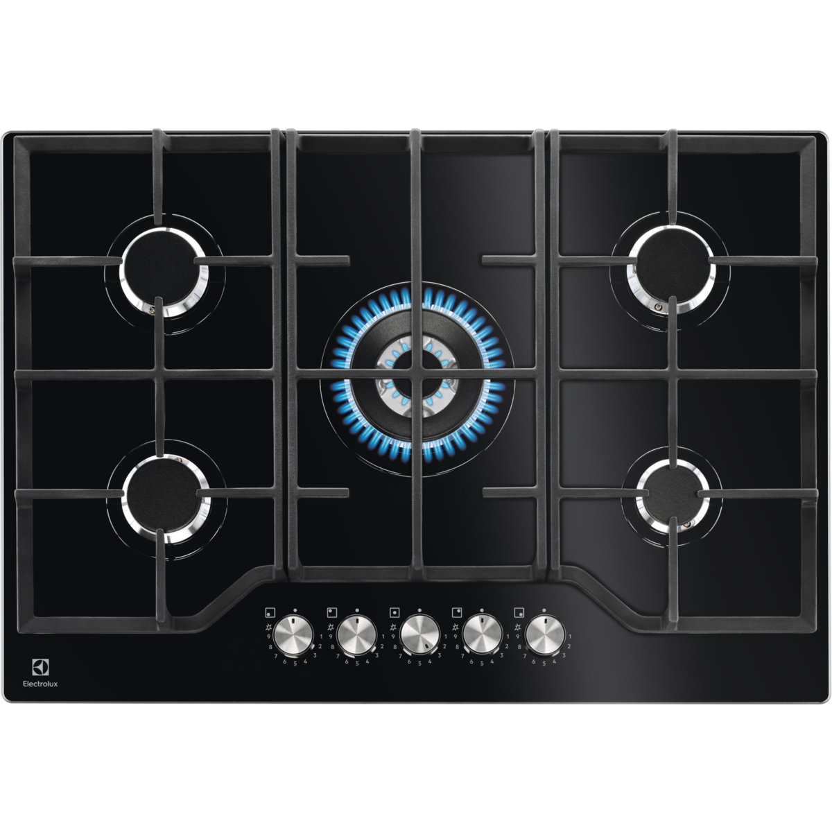 75 cm - Nuova estetica Gas on Glass - Step Power - 5 fuochi - Bruciatori ad alta efficienza +20% Speed Burner - 1 Bruciatore Wok multicorona (4Kw) - Griglie in ghisa - Accensione integrata nella manopola - Sicurezza Sicurgas - Estetica cristallo temprato nero e manopole finitura nero/inox