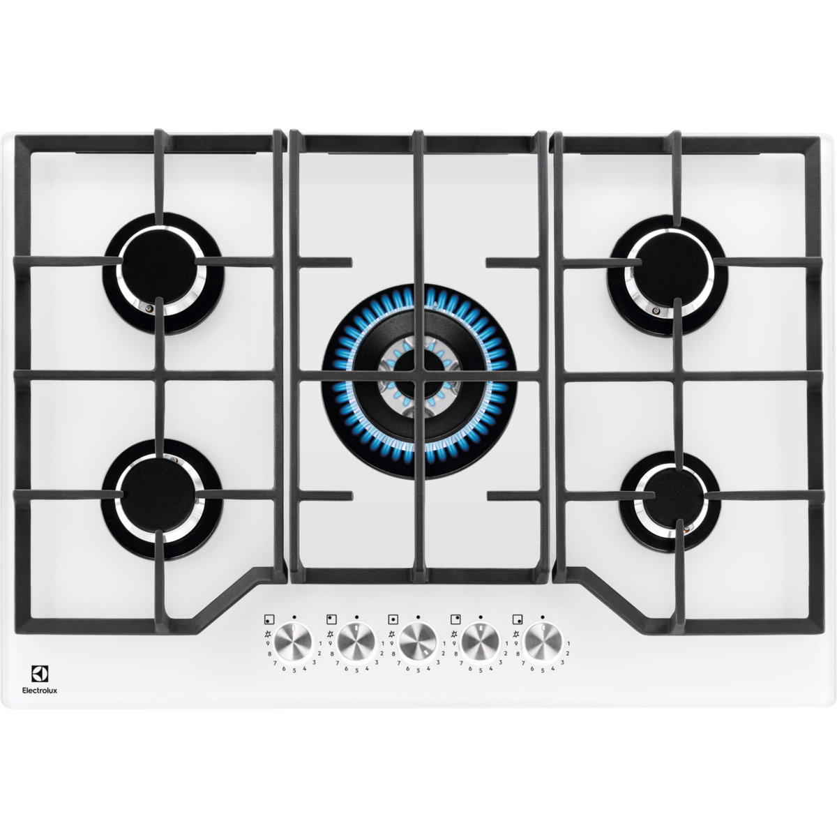 75 cm - Nuova estetica Gas on Glass - Step Power - 5 fuochi - Bruciatori ad alta efficienza +20% Speed Burner - 1 Bruciatore Wok multicorona (4Kw) - Griglie in ghisa - Accensione integrata nella manopola - Sicurezza Sicurgas - Estetica cristallo temprato bianco e manopole finitura bianco/inox