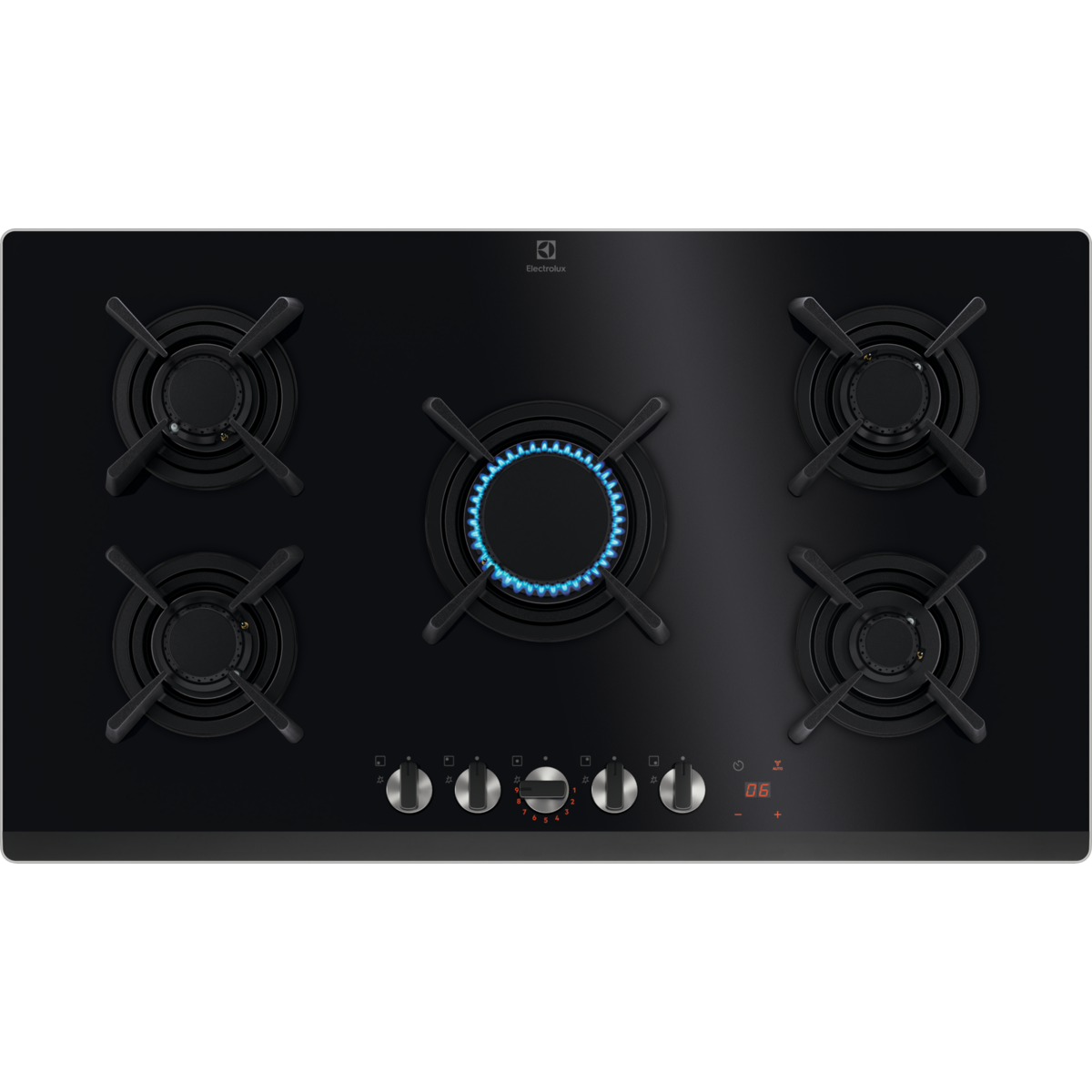 90 cm Gas on Glass - FlameLight - Indicatori LED - Step Power - 5 fuochi di cui uno Hi-Power 3,8kw - Nuovi Bruciatori VerticalFlame - Griglie singole in ghisa - H2H - Accensione integrata nella manopola - Sicurezza Sicurgas - Buzzer: funzione segnale acustico - Indicatore di calore residuo - Estetica cristallo temprato nero e manopole finitura nero/inox con bruciatori Matt nero opaco con specialetrattamento EasyClean lavabili in lavastoviglie