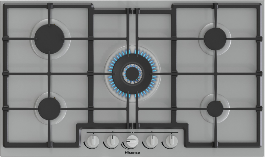 Piano a Gas 90cm inox, 5 zone, bruciatore Wok, griglie in Ghisa, fit nicchia da 48cm